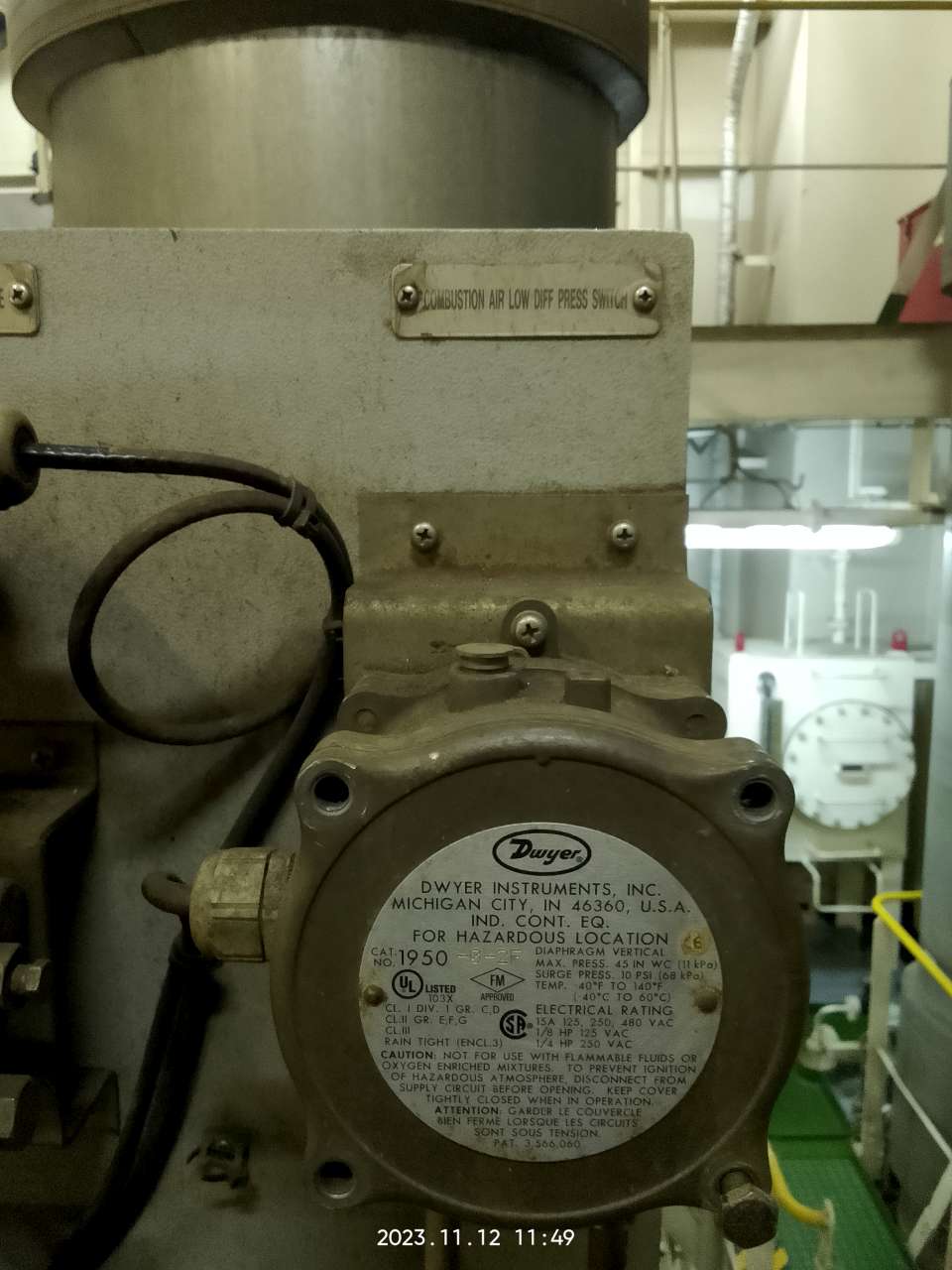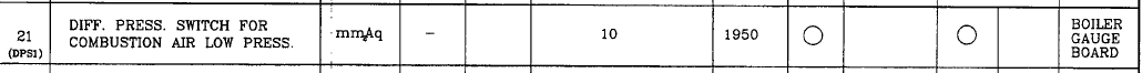 DIFF. PRESS. SWITCH FOR COMBUSTION AIR LOW PRESS UNIT : mmAqType : 1950name plate detailsDWYER INSTRUMENTS, INC MICHIGAN CITY, IN 46360,U.S.A.IND.CONT. EQ.FOR HAZARDOUS. LOCATION CAT NO. 1950 -0 -2FDiaphragm vertical max PRess. 45 IN WC ( 11 kpa) Surge Press 10 psi ( 68kpa)temp. -40C TO 140 C ( -40 to 60C)Electrical rating 15A , 15, 250, 480 VAC 1/8 HP 15 VAC 1/4 HP 250 VAC
