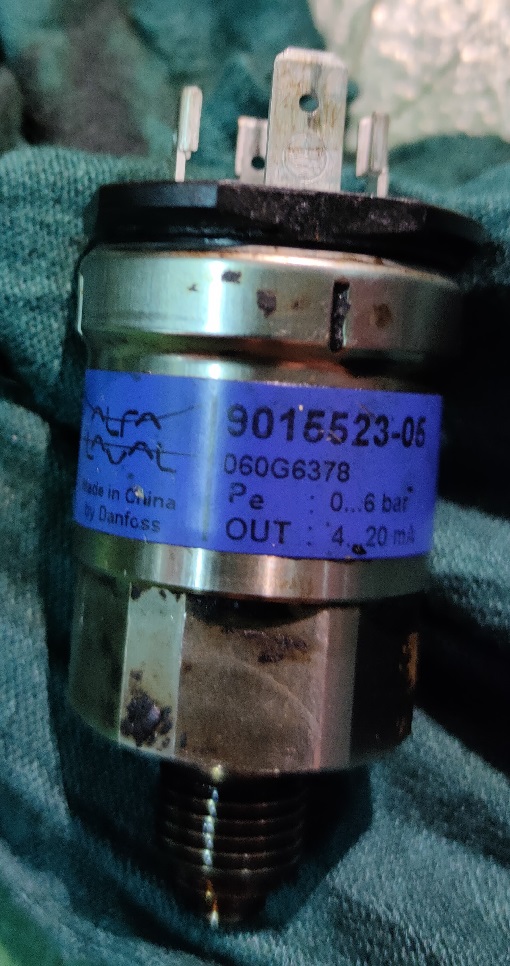 PRESSURE TRANSMITTERMAKER: ALFA LAVAL,PART NO:060G6378,ITEM NO:MBS 3100SUPPLY:9....32V D.C,Pe: 0.....6 bar,OUT:4.....20 mA.