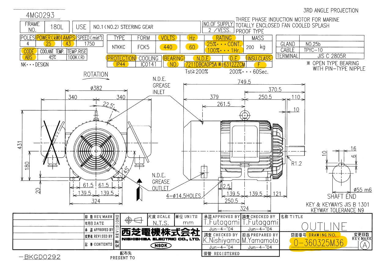 Steering gear motor details :440V, 60 HZ, 25 KW, 1800 RPM, CONT. = 25%1 HOUR= 100%60 SEC.= 200% Please find attached Details.
