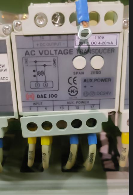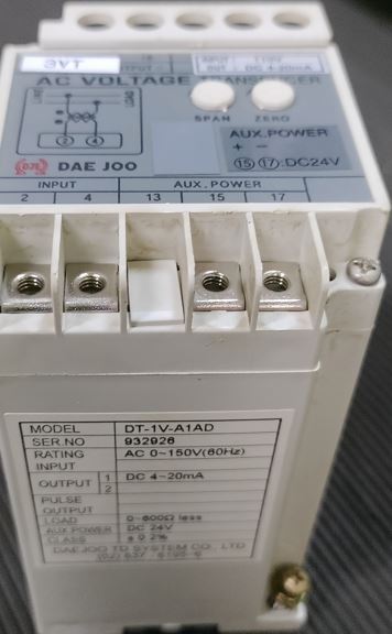 AE#2 VOLTAGE TRANSDUCER IN-OPERATIONAL. MODEL: DT-1V-A1ADSER.NO. : 932926RATING INPUT: AC 0~150 VOLT 60 HZ OUT PUT :DC 4~20 mALOAD:0~600 OHM LESSCLASS : + - 0.2 %