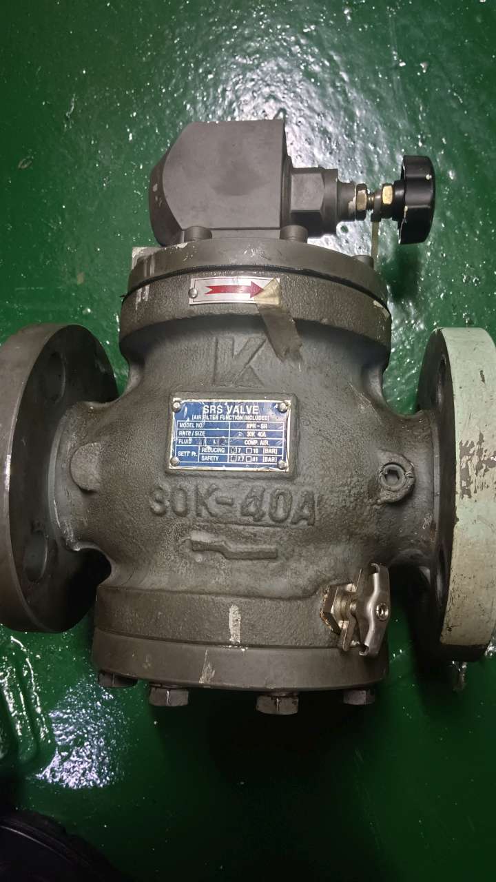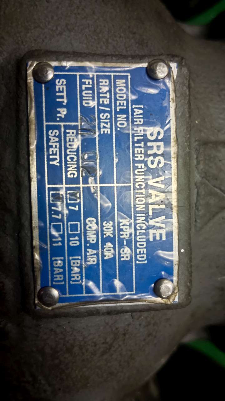 STARTING AIR PRESSURE REDUCING VALVE, MAKER - SRS VALVE (AIR FILTER FUNCTION INCLUDED), MODEL NO - KPR-SR, RATE/SIZE - 30K - 40A, FLUID - COMP.AIR , SETT.PR - REDUCING - 7 BAR, SAFETY - 7.7 BAR